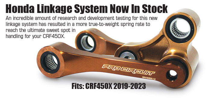 CORONA, CA - March 6, 2025 - The Pro Circuit Linkage System for the 2024-2025 Kawasaki KX450 and 2025 Kawasaki KX250 enhances handling by improving suspension performance. Unlike the stock linkage, which begins stiff and softens deeper into the stroke, this system offers a plusher initial feel while progressively firming up, thus reducing the need for stiffer high-speed valving. Designed similarily to the 2019-2023 KX450 linkage, it optimizes spring rates for enhanced balance, improved traction, and a smoother ride.