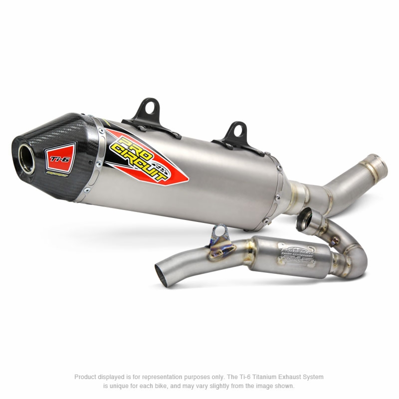 The Ti-6 Titanium Exhaust System is designed to improve performance and is constructed of titanium throughout the head pipe, mid pipe, and canister while the end-cap is constructed of carbon fiber. The Ti-6 is ideal for any closed-course or off-road racer looking for improved performance, durability and a professional look. Although the Ti-6 will not pass FIM sound requirements seen in professional racing here in the states or in Europe, the Ti-6 will meet AMA amateur noise requirements, and comes equipped with a removable USFS approved spark arrestor making it easy for riders to alternate between off-road and closed-course racing.