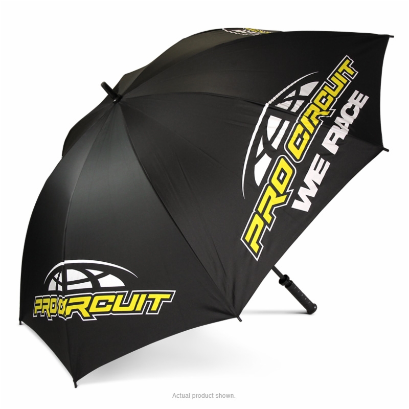 The Pro Circuit umbrella features a manual open and close system, nylon shell with Pro Circuit and We Race logos, durable black frame and rubber handle. A perfect way to shield yourself from the rain or to grab some shade during those hot days at the race track.