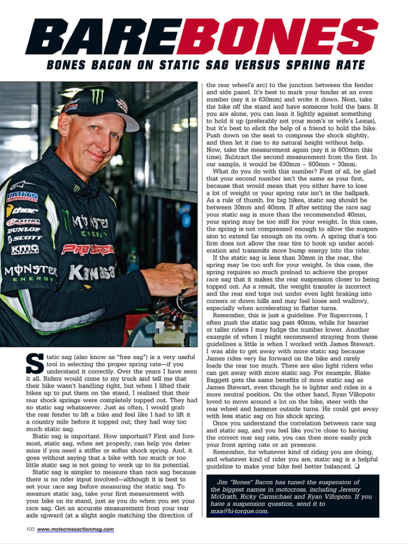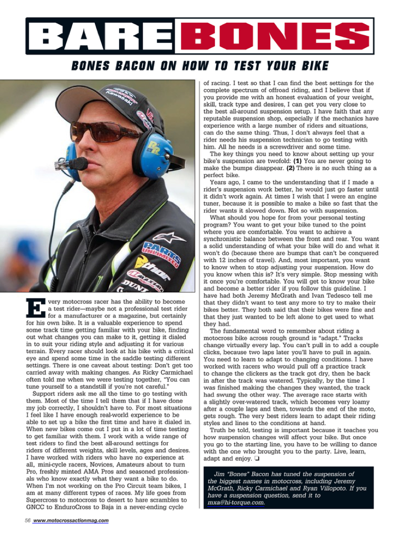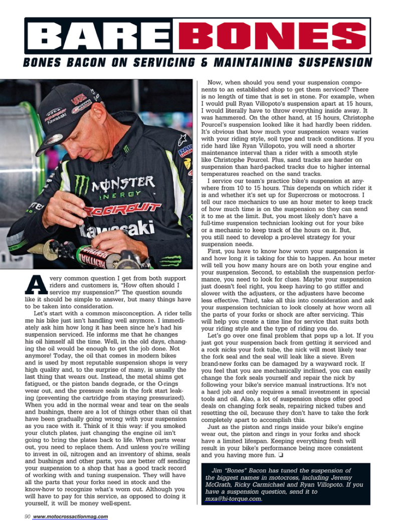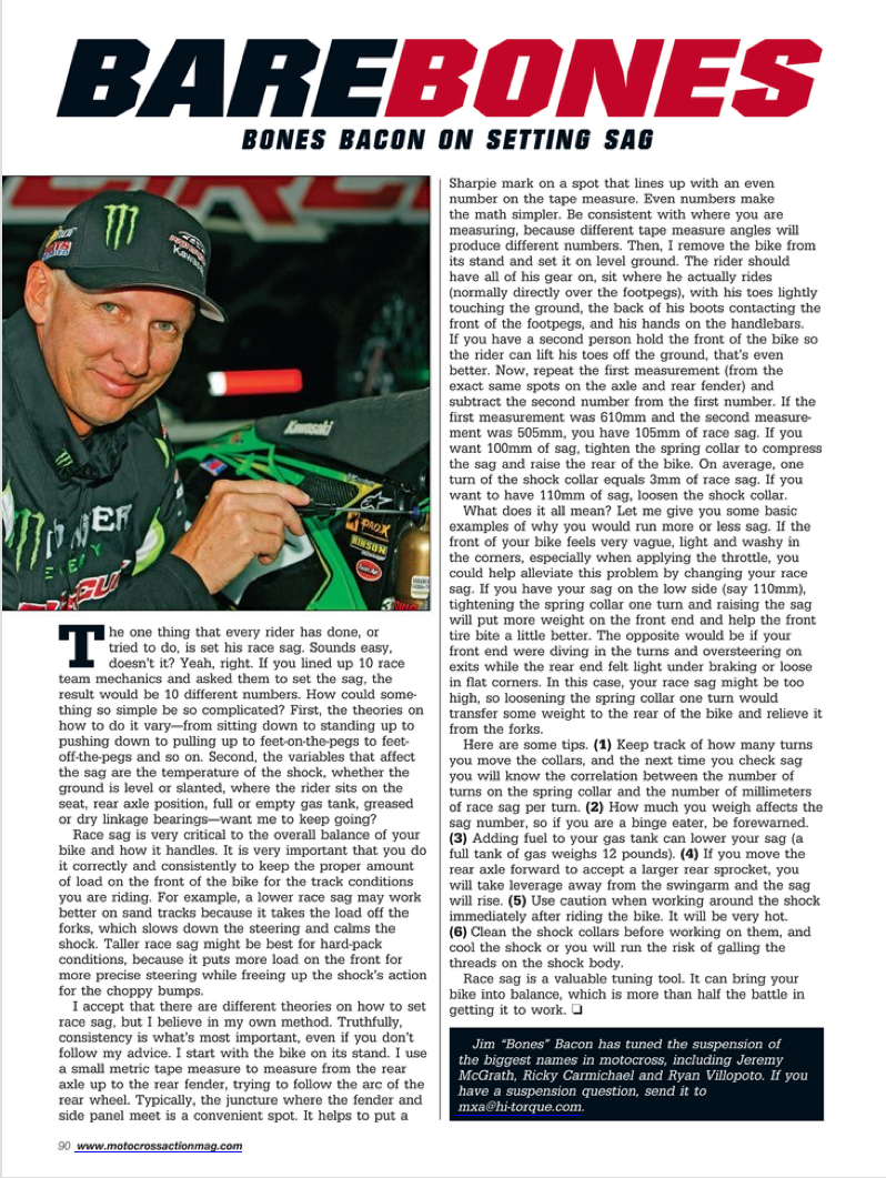 Bare Bones was a monthly article in Motocross Action Magazine written by our past suspension specialist, James "Bones" Bacon. Bones shines a little light on the most sought-after suspension questions from customers, the basics and some overall good racing advice for your motocross journey. Take a look at some of these articles if you're looking to take your suspension knowledge a little further.
