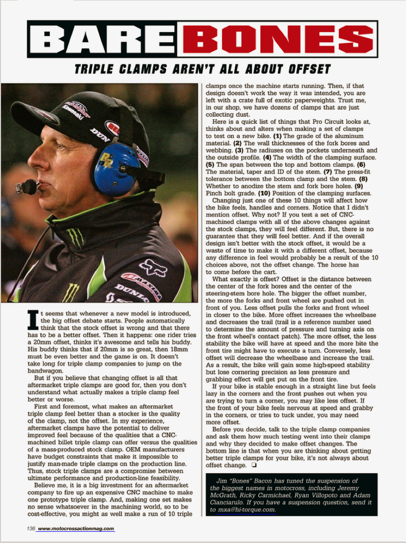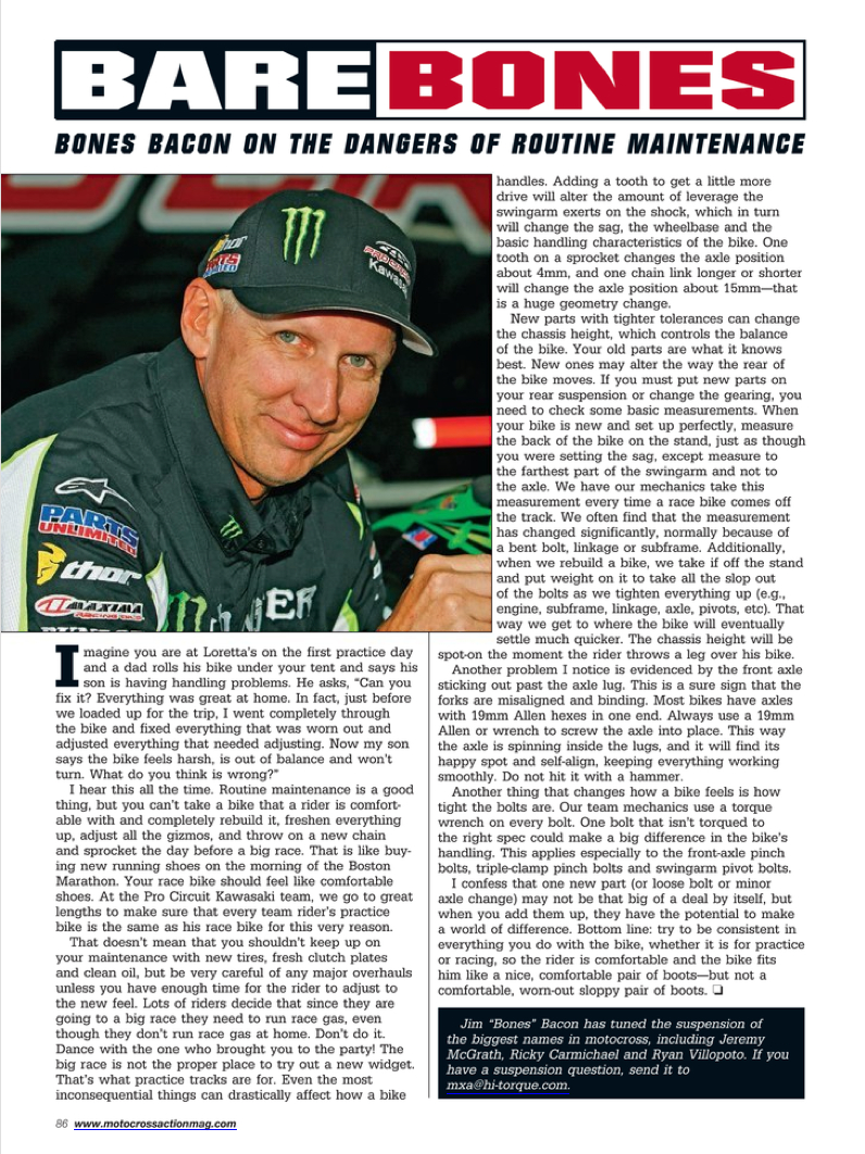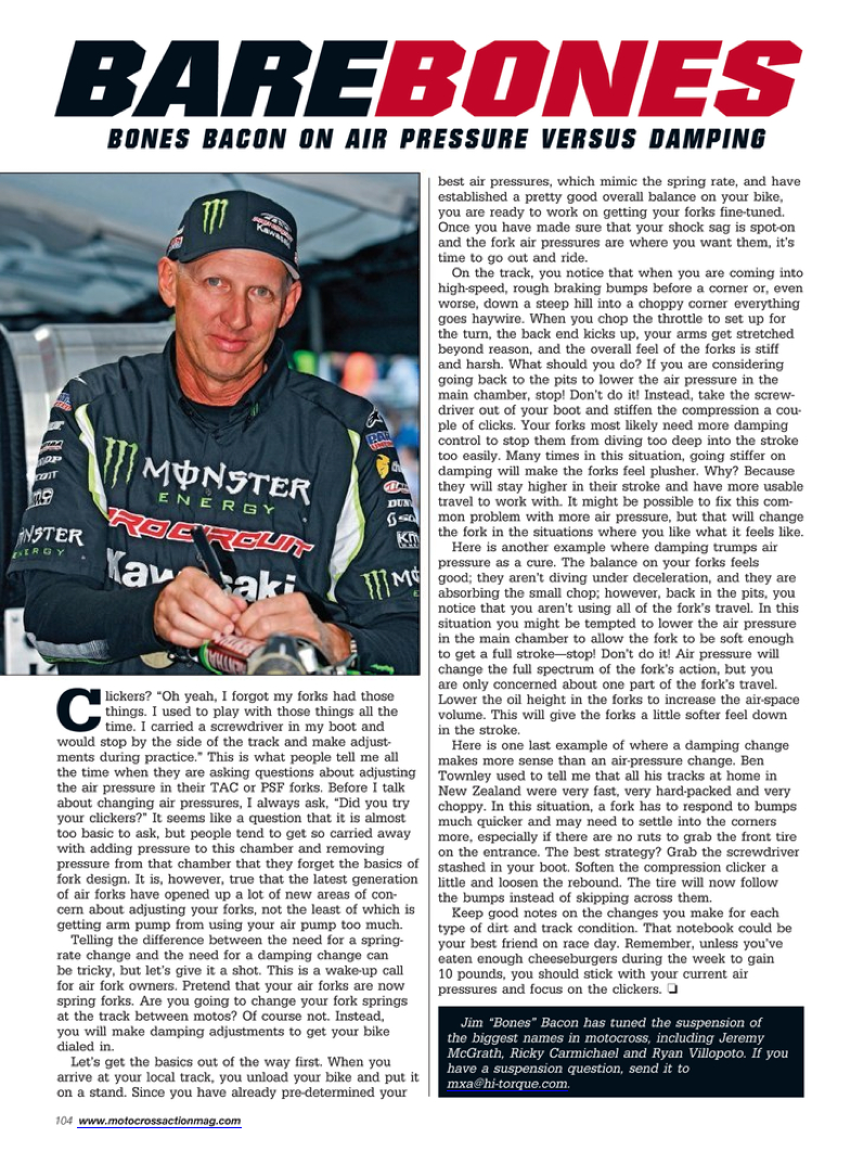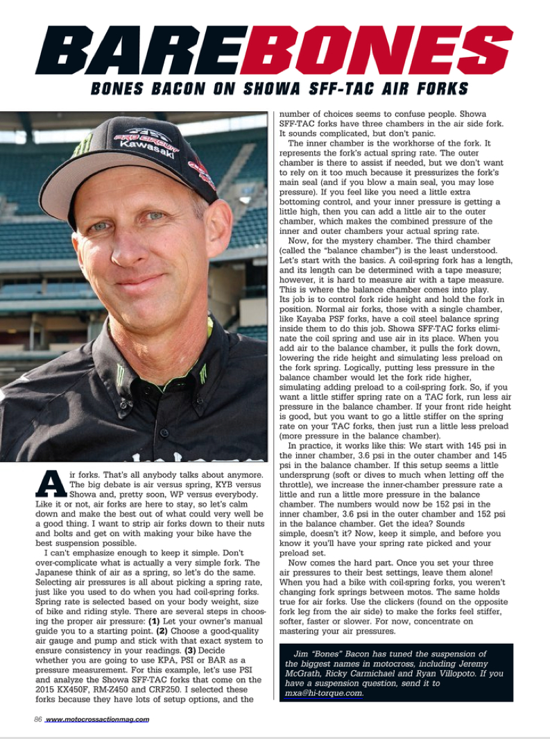 Bare Bones was a monthly article in Motocross Action Magazine written by our past suspension specialist, James "Bones" Bacon. Bones shines a little light on the most sought-after suspension questions from customers, the basics and some overall good racing advice for your motocross journey. Take a look at some of these articles if you're looking to take your suspension knowledge a little further.