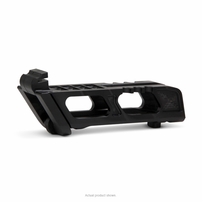 The replacement insert is CNC-machined from high-density polyethylene, providing a durable, long wearing and low friction surface for the chain to ride. The insert fits tightly within the bracket, reducing the clearance between the chainguide block, and sprocket. This also contributes to a more direct and precise feed of the drive chain to the rear sprocket, reducing the likelihood of chain derailment. The insert also wraps around the front face of the bracket to provide wear protection.