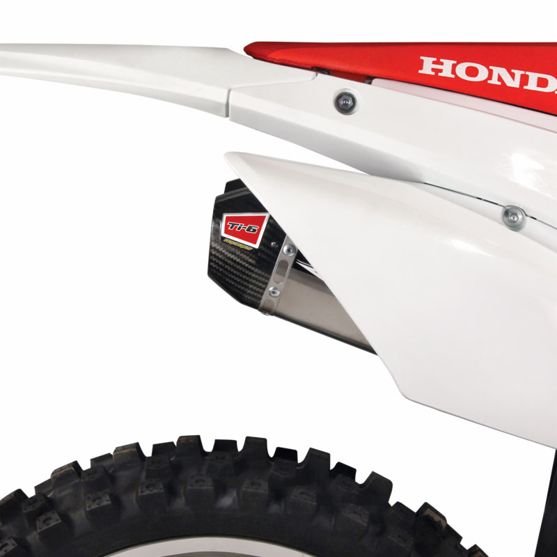 The Ti-6 Titanium Dual Exhaust System for the 2014 CRF250R is designed to improve performance and is constructed of titanium throughout the head pipe, y-collector mid pipe, and canisters while the end-caps are constructed of carbon fiber. Improving power where the Ti-5 showed weak points, and based on customer feedback, a distinctive sound was also created to try and accommodate the current motorcycle rider.