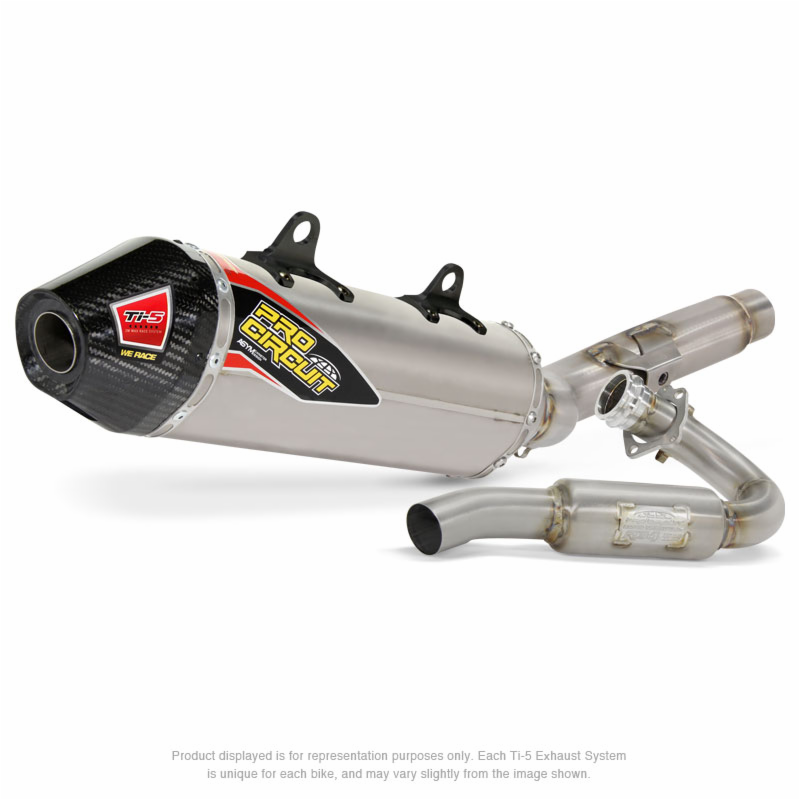 The Ti-5 Exhaust System is constructed of titanium throughout the muffler can, header and mid pipe areas. Designed for optimum performance, riders will enjoy increased horsepower while still meeting the 2-Meter max sound requirements. Unlike other Pro Circuit exhaust systems, the Ti-5 offers consumers the choice between a titanium or carbon fiber end-cap. Additionally, the asymmetrical muffler configuration maximizes packing volume to ensure sustained performance.