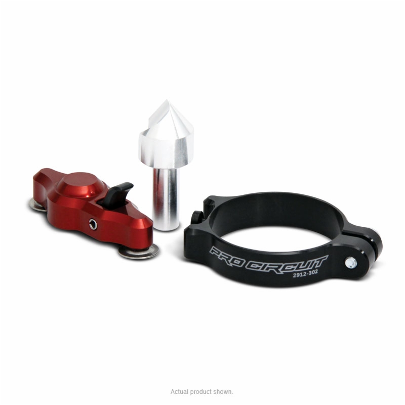 The Pro Circuit Launch Control device will help compress the forks down a few inches from the normal seated position on the bike. When locked down at the start of a race, more load will be placed on the front end instead of the rear, lessening the chance of a wheelie out of the gate.