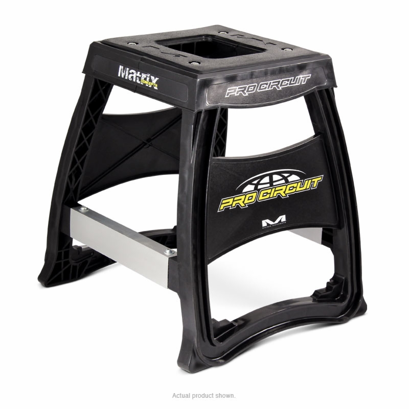 Pro Circuit's new bike stand is one of the most trick, lightweight and durable bike accessories we have ever offered. Manufactured by Matrix Concepts, this stand is constructed from a blend of polycarbonate plastics and designed with anti-flex supports to help promote strength and eliminate rocking, which helps set it apart from a lot of the traditional metal stands.