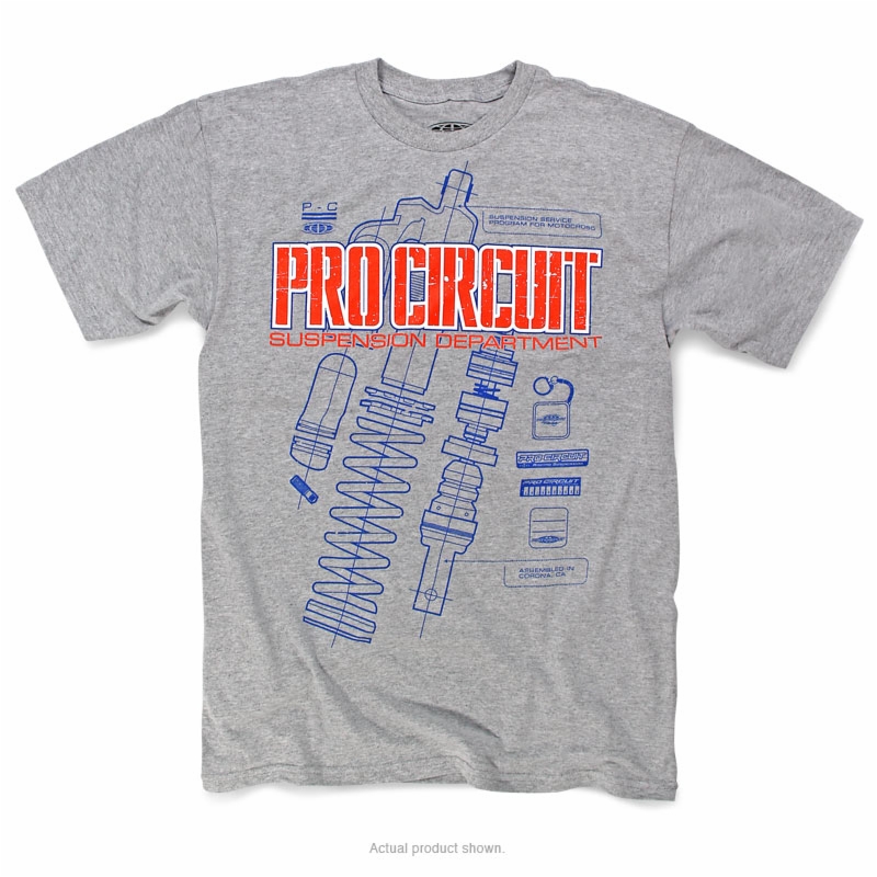 Track through the rough bumps and ruts the day throws at you with the Pro Circuit Suspension Department Tee. A suspension graphic is printed on the front and upper back of this athletic heather tee.