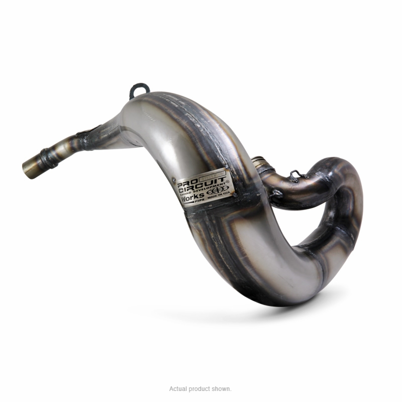 The Pro Circuit Works Pipe offers unparalleled performance and power for every two-stroke application. This Works Pipe off-road version is designed with more ground clearance to help avoid pipe damage from rocks, and still offers increased horsepower and torque gains across the entire rpm range. The unplated, oiled metal finish requires some maintenance, but really gives your bike that "works look".